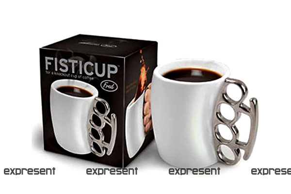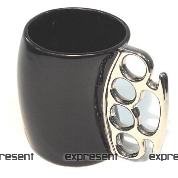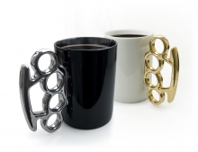Есть два вида: белая кружка с золотым кастетом и чёрная кружка с серебряным кастетом. На ручке износостойкое металлизированное напыление. Можно мыть в посудомойке, но нельзя греть в микроволновкеРазгромите ваш предстоящий день с помощью горячего кофе в оригинальной чашке с кастетом. Керамическая чашка цвета слоновой кости с ручкой, покрытой никелем, упакована в красивую подарочную коробку. Отличный и прикольный подарок :) Обратите внимание на прикольную закругленную форму чашки..