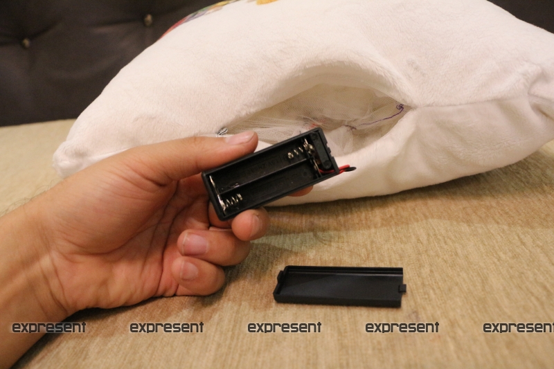 В каждой подушке под потайной молнией находится блок питания, там используется 2 ААА батарейки. Внутри подушки есть включатель и выключатель.